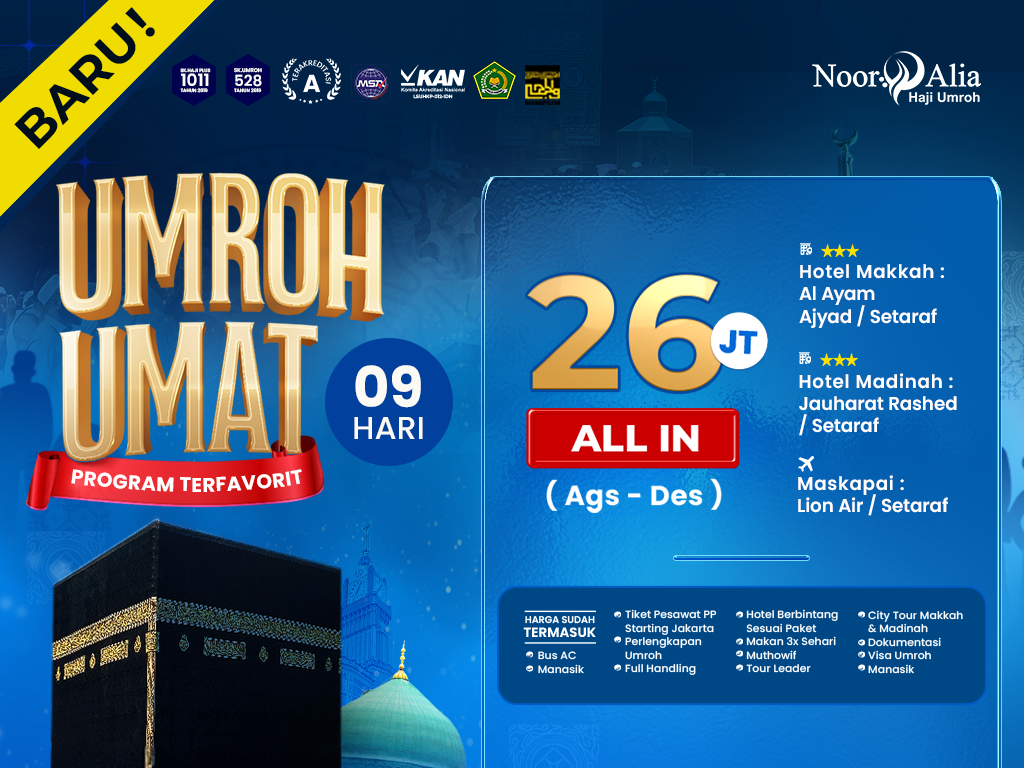 - Perlengkapan : Koper kabin, koper bagasi, tas paspor, kain ihram/mukena, sandal, buku manasik, kain seragam, syal, & sabuk